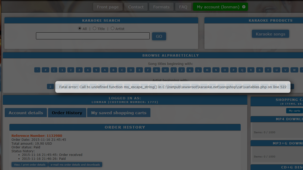 d-iivil wrote: Lonman wrote: SBI is direct download as well. There's a direct download available if you login, go to "My account" => "Order history". Direct download links are also shown right after the payment if PayPal has had time to process and confirm the payment behind the scenes before you get redirected back to Karaoke.NET website. E-mail is just a backup so you can access your downloads from any device where you have access to your e-mail. Ps. sorry for my crappy english. - Riku Your English is just fine I was logged in. Went to "My Account", then "Order History". It gave me two options, 1) View/Print orders (detailed receipt (nice!!), 2)email me order details & download - this is where it gives me an error message on the page and locks up the page. Here is a screen shot of the error. It doesn't show any other download links in my account info at all.