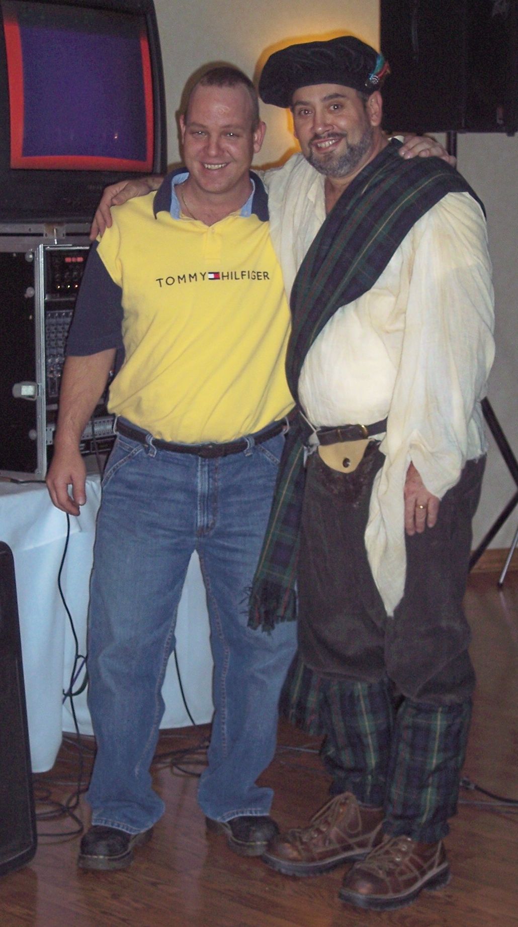 i have wore different costumes or attire to different party's, i've yet to wear a tux but i think i am gonna buy one. man you can get them cheap on the net...but i don't no why i have just about vowed to never do another wedding, its just too stress full for all the partys involved. i like the relaxed house partys, where people are there just to get tuned in and party......anyway i thought it would be fun to post some pics from anybody willing too, i bet dog the booty hunter has some........this photo was of an irish themed wedding i am dressed in traditional scottish attire, my wife had made me this costume for halloween party it came in handy. my right hand man thats with me died last year at just 35 of acute pancreatitis he left a wife and 3 lovely children, which my wife and i help out when they needs us. he was one of the funny est guys you ever met