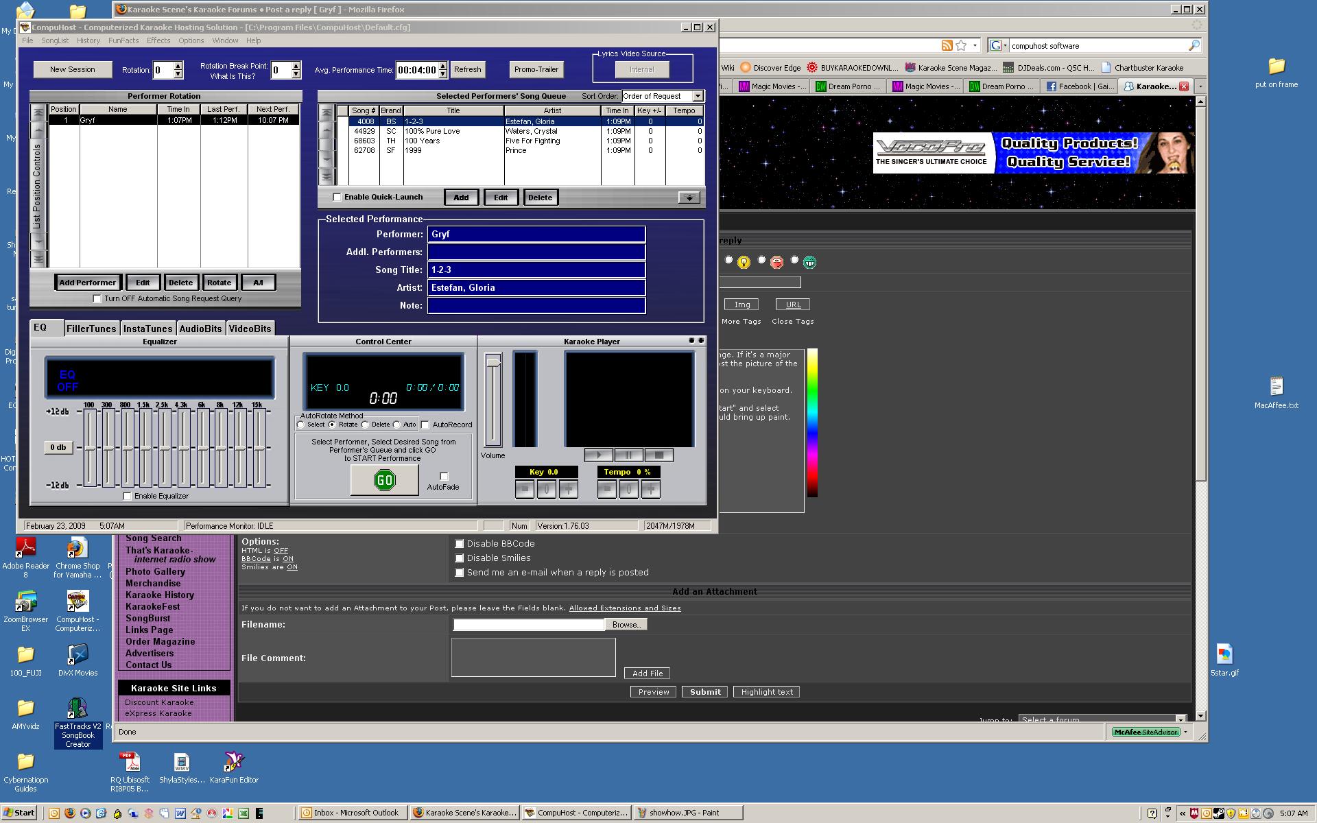 For a show pc, you don't need ANYTHING other than the player software! I hate to sound like a broken record, but the player pc needs to be as clean as possible. Don't use ANY un-needed programs. That's why it's hard to take a pc that you used at home or a store-bought one and use it for karaoke. It always amazes me the junk people have on their pcs... that stuff takes up valuable resources, and cause cause conflicts left and right!