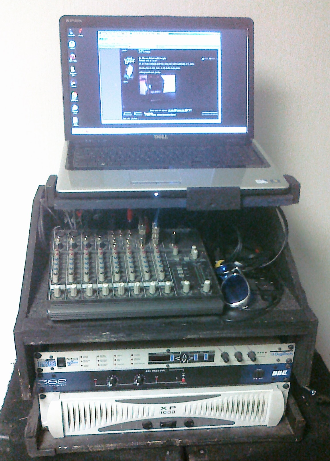 Here's my current home built road rig I pieced together after years of trial and error. Rack contains my Mackie VLZ mixer, a USB hub, Berringer USB audio interface, 30gb iPod (used for fill/voiceover music), Digitech DSP effects, BBE Sonic Maximizer, and a Phonic XP amp I picked up recently that powers a pair of Yamaha BR15's nicely. To get it up and running, I just sit the rack on my custom built collapsible DJ booth, sit the laptop on the stand, plug in the laptop AC adapter and the USB cable into the laptop, connect the speakers to the amp, and then plug the rig into a 110 wall outlet. I can have the whole rig in the club and have music playing in less than 15 minutes. The only 'outboard' equipment is the wireless mic receiver, which sits on the fold out table area on the right side of my collapsible DJ booth. Everything (including light tree) fits nicely in my 3 series BMW.