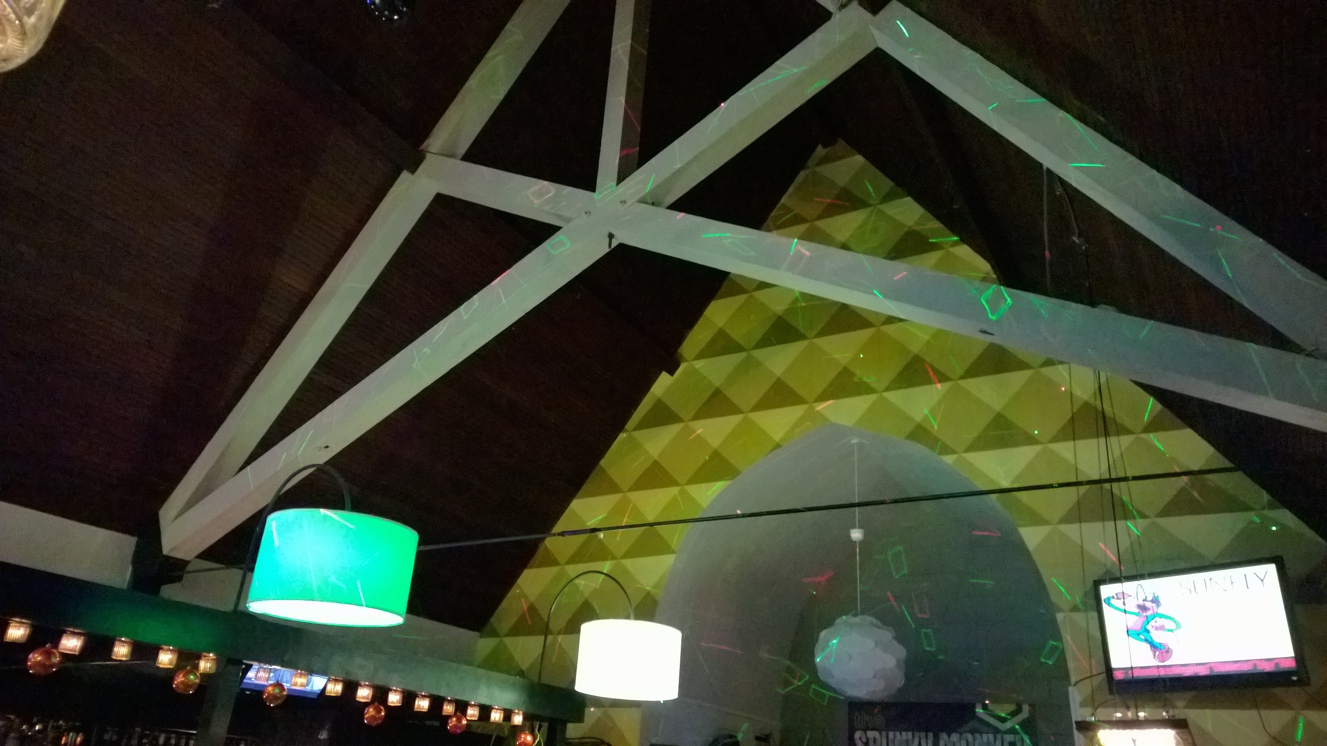 Alan B wrote: I am looking for new ways to differentiate a Feel Good Pros karaoke experience from everyone else. And just where do you plan to place your lights at the venue?[/quote] This is the stage area....very darker. The overhead light is unfortunately on the same dimmer as the rest of the bar which they want darker at night. Attachment: