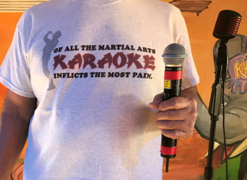 All singers good or bad are welcome to sing at my show. Karaoke is supposed to be fun, not cutthroat competition. I have a singer not as good as the others, a little tone deaf & simply sings off-key at times; but he’s always upbeat with a good sense of humor. He knows he’s not good at singing so one night he wore this hilarious t-shirt as a self-deprecating humor & just to have fun. He leaves the stage & earned the loudest endearing applause that night.  The song: "Hurts So Good" by Mellencamp. Attachment: