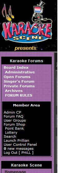 KARAOKE SCENE MAGAZINE ONLINE! - How to Access Private Messages Administrative Comments, Suggestions & Questions Karaoke Scene's Karaoke Forums Home | Contact Us | Site Map