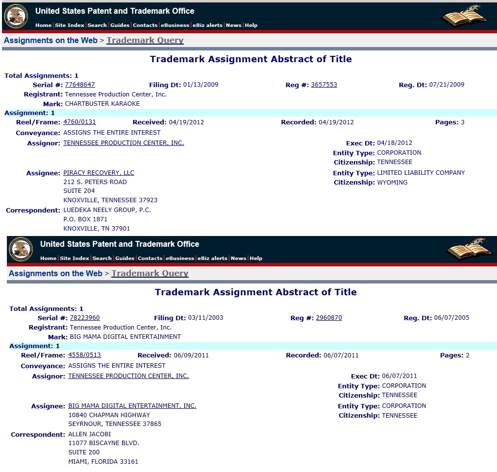 So, when CAVS USA filed suit against Tennessee Production Center on 10/18/2011 Tennessee Production Center was still the owner of the Chartbuster Trademark. When the Default judgment was first issued on 04/17/2012 Tennessee Production Center was still the owner of the Chartbuster trademark. Big Mama Digital Entertainment never owned or controlled the Chartbuster trademark. In fact the transfer of the Big Mama Digital Entertainment trademark from Tennessee Production Center to Big Mama Digital Entertainment happened on 06/07/2011 days after Tennessee Production Center entered into a settlement agreement with Lynns Corp. of America and Victor Tsai on 04/29/2011. It was a settlement agreement that Tennessee Production Center promptly defaulted on after shuffling their assets. This default of their settlement resulted in a judgment against the Tennessee Production Center in the amount of $1,200,000.00 on 09/07/2011. Tennessee Production Center was still the owner and controller of the Chartbuster Trademark at that time as well. Of course after that, there was no point to responding to the CAVS suit that directly followed, the only move left was to unload product as fast as possible and try to shuffle the assets to new entities. Those entities include Piracy Recovery LLC which was described in an Arizona lawsuit filed on 04/20/2012 as: Case 4:12-cv-00298-DCB Document 1 Filed 04/20/12 wrote: 7. Plaintiff PR is a Wyoming limited liability company having its principal place of business in Knoxville, Tennessee. 27. Plaintiff PR is an affiliate of, and successor-in-interest to certain rights formerly belonging to, another of the leading U.S. manufacturers of karaoke accompaniment tracks, commonly known as Chartbuster Karaoke (“Chartbuster”). HarringtonLaw wrote: Nothing was "handed" to PR, nor "shuffled off" to DT. As I indicated before, the trademark, the catalog, and other assets were used as security for a note. Big Mama defaulted on the note, and the investors foreclosed.