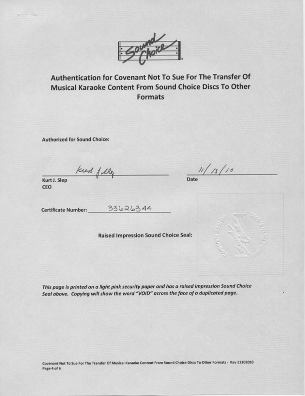 Had Sound Choice obtained all of the proper licensing for all of its tracks, this might not be an issue. Now the ugly possibility has reared it's head that music publishers might name Sound Choice customers, especially at this point GEM owners, as contributory infringement defendants in copyright lawsuits.