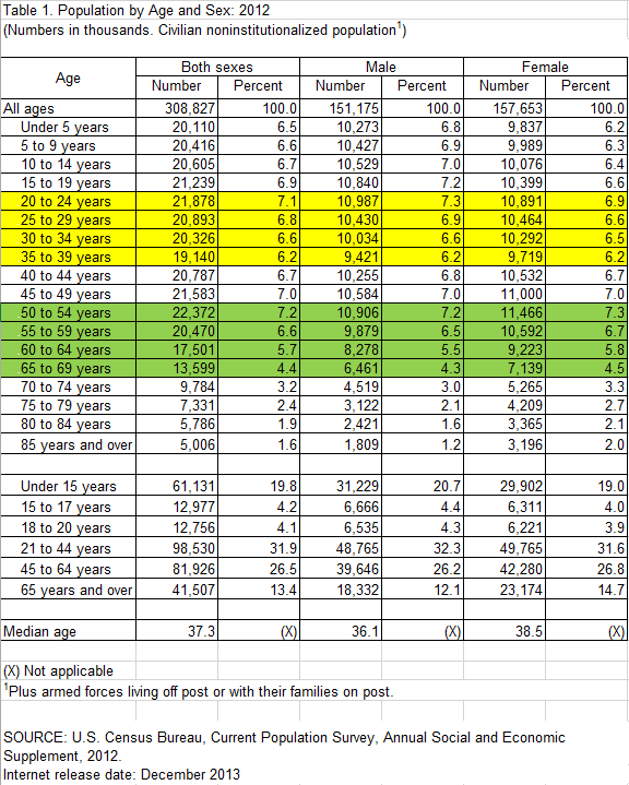 Lone Ranger - You keep saying this over and over, but in reality, the Baby Boomer generation is NOT as large as you think. The Baby Boomers are defined as those born from 1946 to 1964. So people currently 50-68 (we'll call it 70 for easy math) The census figures from 2012 indicate that the US population of those 50-69 is ~ 73 Million. The segment of the population that is 20-39 is 82 million. (larger) The segment of the population that is 30-49 is 81 million. (larger) Sure, the baby boomers currently have more expendable income, but they are also (forgive me) dying off a lot faster than the other two age groups. Strength in numbers and the fact that there are a LOT more 20-40 year olds in bars than 50-70 year olds and I feel it is a pretty safe bet to continue catering to the younger generations. Data Link - http://www.census.gov/population/age/data/files/2012/2012gender_table1.xlsxAttachment: