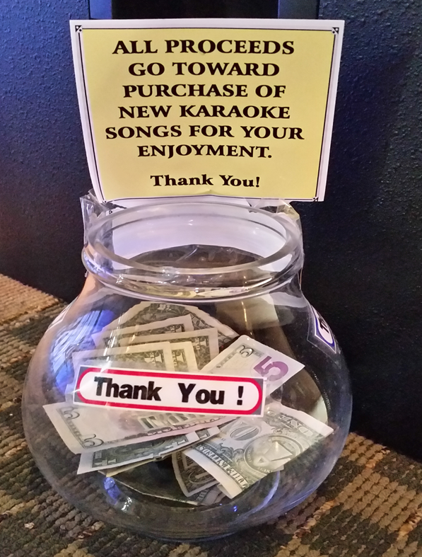 chrisavis wrote: We don't let the singers pay for any of the tracks we buy though some tip the respective hosts. Smoothedge69 wrote: I buy all my songs, but if I get tips, I put them towards songs. I don’t expect my singers to pay for their requested song tracks either. But sometimes they will give me $3 or $5 to cover the download. I make it a point not to touch the money being handed to me because it can be interpreted as I’m accepting a bribe & that person will get preferential treatment. That’s when I tell them if they really want to - they can drop it to my “song fund” jar. And I really mean ALL will be used to purchase more songs. Attachment: