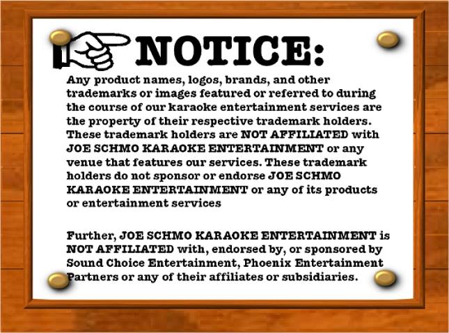 JimHarrington wrote: Sound Choice Entertainment was created to use the dominant market position of our brand to improve the services aspect of karaoke entertainment. The dominant market position of the brand was in the field of producing and selling karaoke tracks, not the arena of hosting karaoke shows. JimHarrington wrote: When SCE was created, we already had more than 500 licensees None of whom contracted to be an associate of SCE. I suspect that all of the thousands of Sound Choice users who existed long before SCE burst onto the scene could make a better case that SCE is the true cause of the confusion they falsely claim exists.