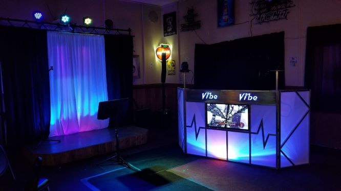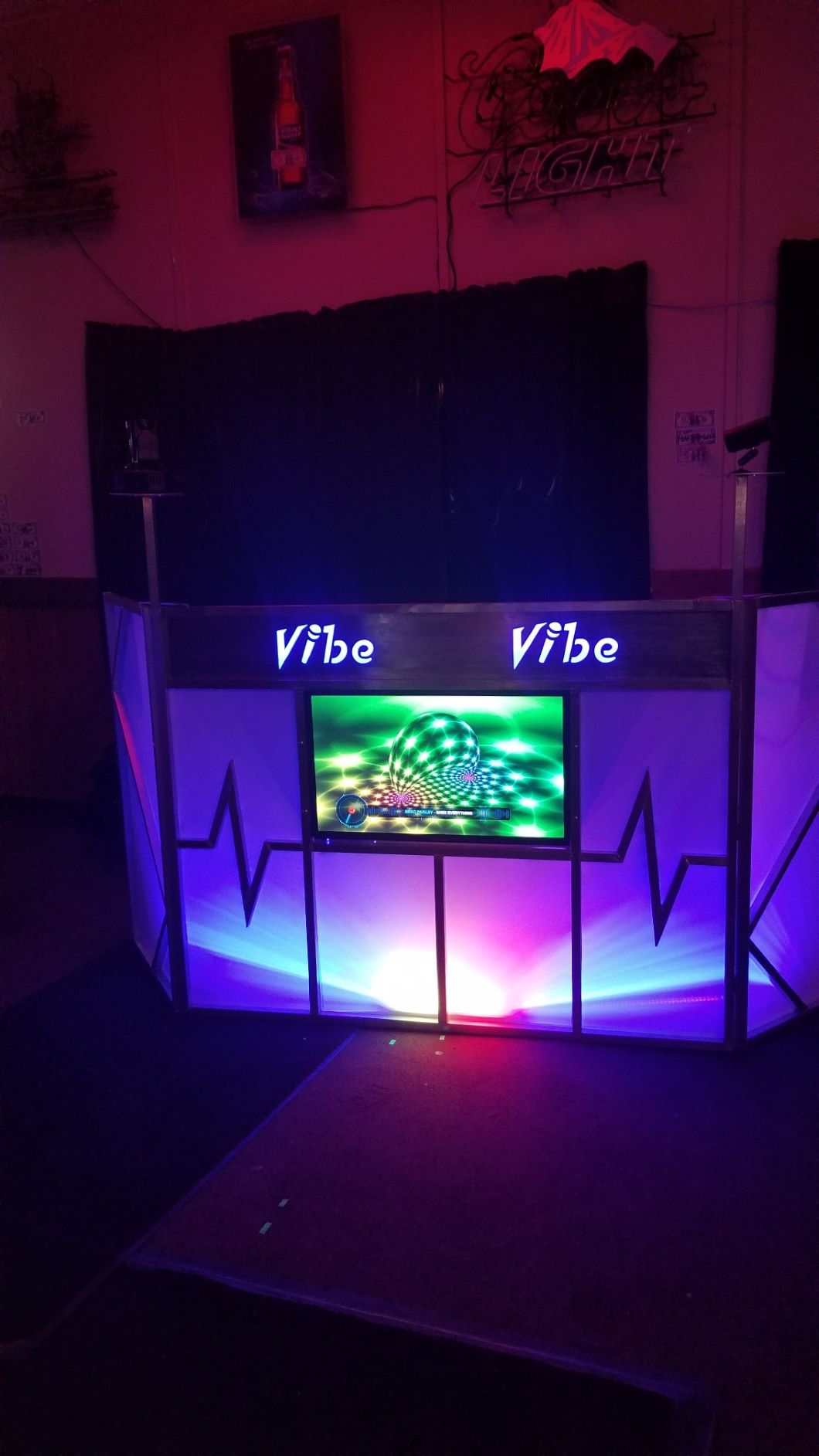 There are lots more pics, but you get the idea. The booth is 48" tall and 62" wide and is an aluminum frame backed with lycra fabric on velcro. Lighting behind illuminates through the fabric. I have a 30"X60" folding table for my gear. I do not have to use the facade if I choose. The TV is a 32" 720P. I use an HDMI splitter to send signals to both the tv's (booth and stage). The frame and tv together weight about 35 pounds. I built the stage riser several years ago for the bar. It's small, but does the trick. It measures 6 foot by 8 foot, and it stays at the bar permanently. The lighting is a simple 10 foot truss that tears down easily. I have attached a double curtain rod to hang the curtains. There is up lighting and down lighting behind the curtain, giving a glow effect. Time to set up or tear down the stage lights and curtains is about 10 minutes. The tv monitor is simply a conductors stand cut down on the top part. It has four holes drilled into into it to match the four holes in the back of a flat screen tv. I use a 28" 720P TV rather than a computer monitor. Total set up or tear down of the entire rig is about 45 minutes Tell me what you think and give me some feedback even tho what is built is done, no changing. There is a few things to explain, like the bar is a small, old dive bar that is in need of major upgrades. Also, you can't see some of the lights in the pics, but they all work great and give a cool effect. There are additional lights that hang from a truss that is attached to the side walls. The lights shine directly at the stage or in any direction I want. The truss is also permanently mounted at the bar for whoever wants to use it. Set up at this bar isn't very flexible, too small of an area to make it look like it fits right, but it works for now. The end results were meant to be used at weddings, corporate parties, etc. But is flexible in its use at any venue. I can use all or part of the entire set up at any time.