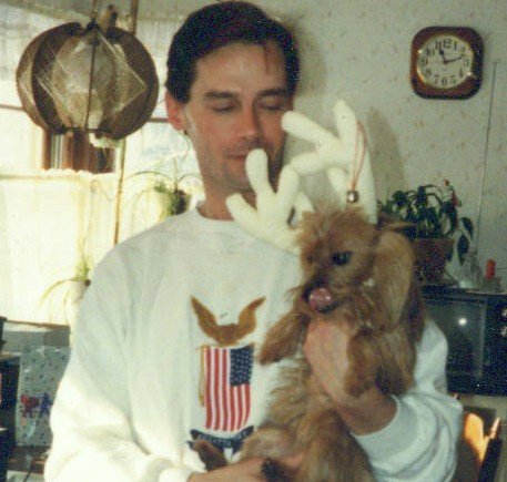 Here's one of me and my Australian Terrier, Bumpy, decked out as a reindeer. The antlers did not stay on very long!