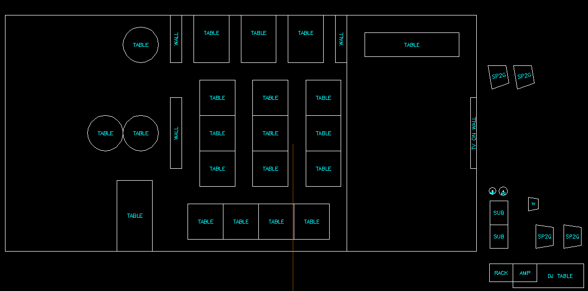 Well, I've been here about 8 times and set up different every time. Not found the sweet spot yet. I've done the subs under the tv most times and that does work best. I've generall been on the bottom rh corner(I'm stuck in the open spot for sure)....where to put the singers is the puzzling part. (I like about what you have, but I fear as we get busier we have to leave that huge table on the top, I had made that part the stage and worked out ok......but it's hard to clear out to set-up, people want to sit there...so that pushes me in a weird spot) They HATE their backs to the auidence, which I understand w/o using the 2nd smaller tv. The two upper walls and the middle wall are full up with booths not tables inbetween (not moveable). The line between the open space and the tables actually in a wall coming down from the celing it's about 7' high the full width. As far as wattage goes, I'm sending the subs 500 (too little) and the sp2g's 450 (when I use all 4) I had the subs bridged and sending them 1400(too much), but ok...but I unbridged to use other channel for a monitor speaker, but can go back. Thanks for looking Ollie, I've been trying different stuff and thinking of every option..just looking for more! MrD