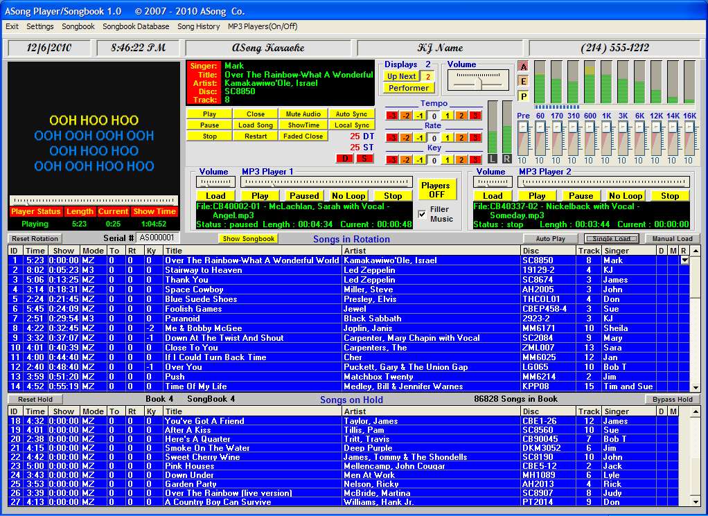 If Hold Bypass is turned on the song goes directly into the Rotation Buffer and if not in KJ mode, auto-play/auto-load on, then the song at the top of the rotation buffer will play automatically and rotate thru all songs in the buffer just like a jukebox. This is true for not only Karaoke songs but MP3s. The 3 MP3 players in the program allow for not only Database controlled MP3 play but manual and auto-filler MP3 play.