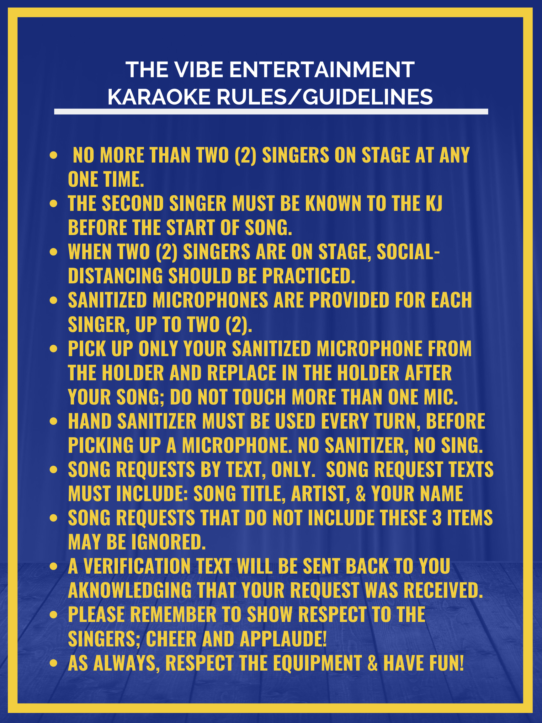 mrscott wrote: And on top of that, it is plainly written in the new rules of karaoke for this new era, for all to see and read. These are posted right in front of my booth and on the walls around the bar. Thanks for giving me an idea to make a poster, which is new rules for singers to follow.