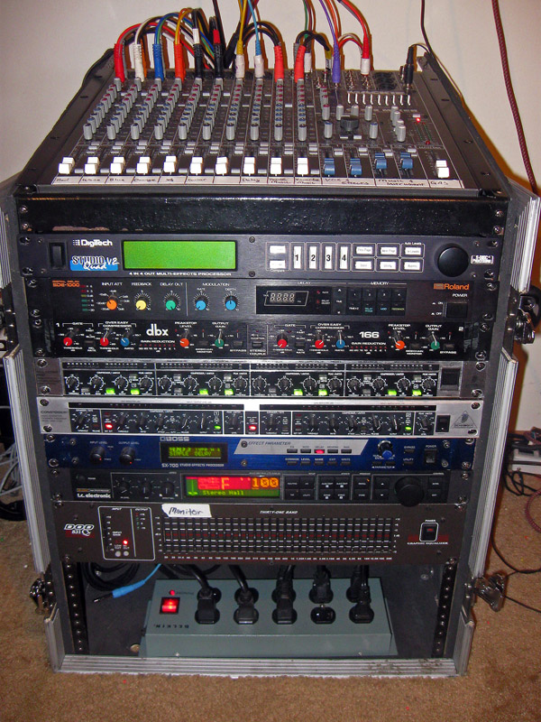 OK well I'm always up for some gear porn so here we go. The first pic is my old rack (now living in the studio). It's a 10x12 space slant top combo rack. When I used it for Karaoke it had wheels mounted on the bottom. For quick setup, the slant top cases like the Odyssey case you're looking at are the only way to go in my opinion. Get a few patch snakes for all your connections from the mixer to the various processors and get patch cables to go between rack units. Then you can leave most everything plugged in all the time (all of it if your mixer has rear inputs). So anyway here's the list of what is in that rack from top to bottom: