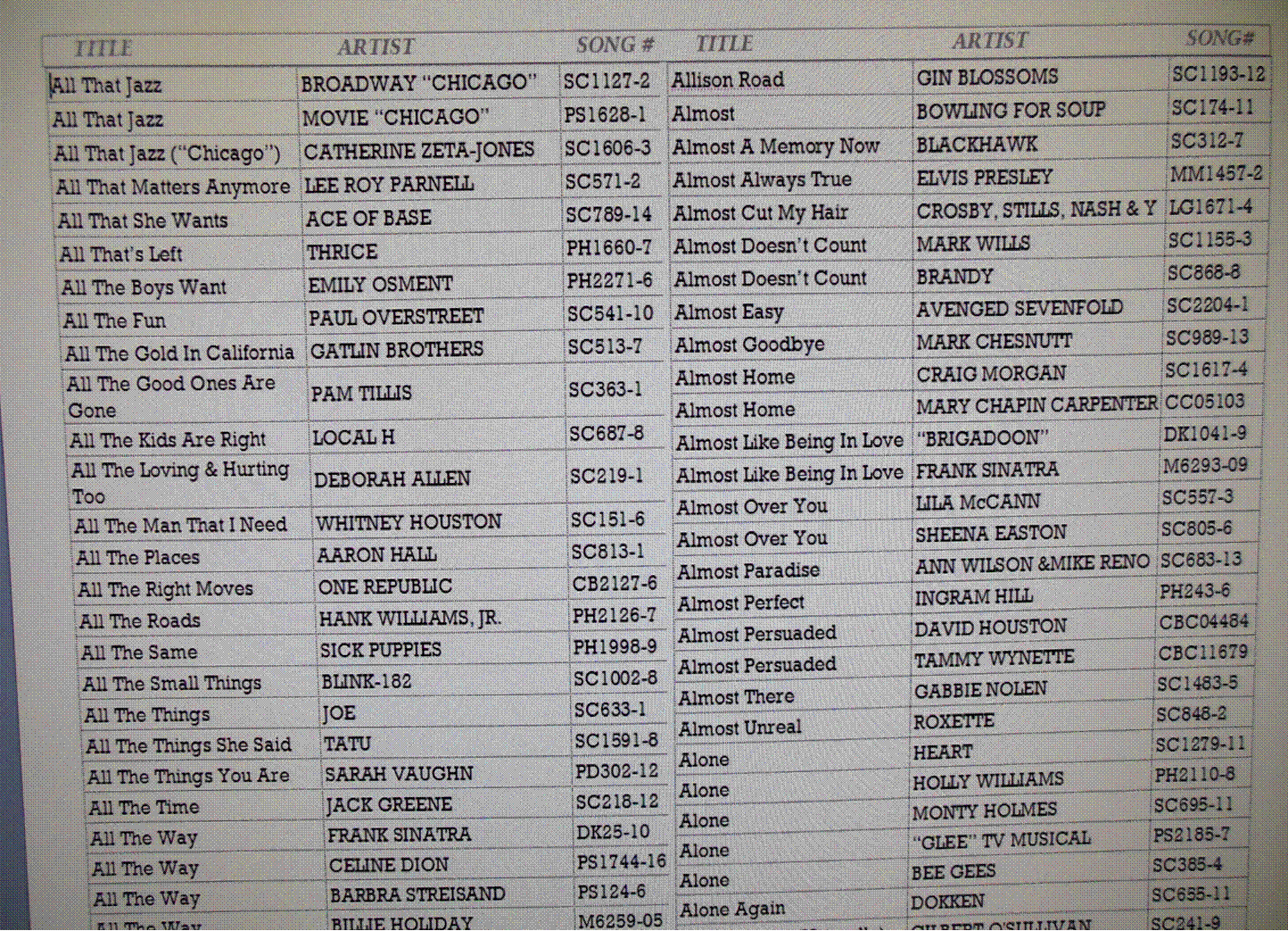 Smoothedge69 wrote: When I finally get down to doing me books, I am going to do half and half. My books will just be titles and artists. Most of my stuff in on computer, and I omitted the disc numbers. Keeps it nice and neat in my computer. If I decide to use my SC, I have them numbered B1 - B38. I started that when i was working that gig back in 04 - 05, to differentiate my stuff from the bar's stuff. The last disc I bought for that gig was SC 8825 Frank Sinatra. All the rest I bought just for me. It's funny, that was my 25th disc, so I numbered it B25. Hopefully you'll at least add a manu code of some sort. Nothing worse for a singer thinking they are getting a good version of something when a Music Maestro or Sweet Georgia Brown version pops up on the screen. Happened to me a few times. I quit singing at shows with no manu indicators of some kind.