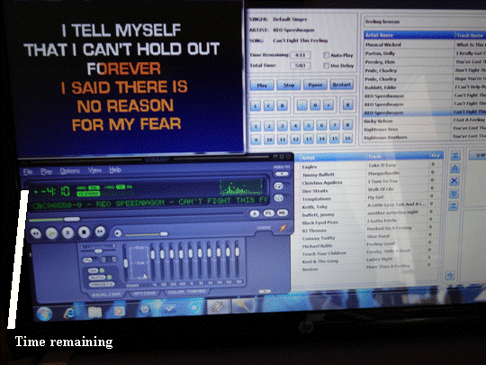 Smoothedge69 wrote: My host software (WinAmp) has a bright, clear digital clock to show either time remaining or time elapsed for each & every song. You actually use WinAmp?? It doesn't have any features but showing the lyrics. Is there a better karaoke plugin besides the standard one??[/quote] Sorry, Smooth, I should've said Winamp as a plug-in to my Sax&Dot Show Presenter.