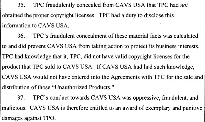 Apparently, CB was supposed to have all licenses in place for all the tracks they agreed to provide to CAVS and did not. (duh) Distribution of that unlicensed material would also constitute infringement and leave CAVS open to a lawsuit as a third-party-defendant. Something they specifically attempted to avoid when they made the agreement with CB.