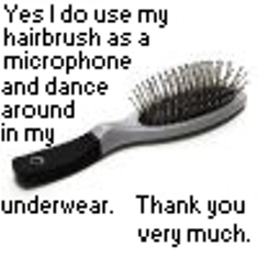 I usually sing in a pair of sweats & a t shirt really so no perverted sings are coming from me  but the hairbrush thing is t-totally me at 15 & 16 singin with my ear to the radio & lookin in the mirror  Ahhhhh...memories...light the corners of my mind...misty water colored memories...etc...  I gotta go to bed now...nighty nite guys see ya tomorrow