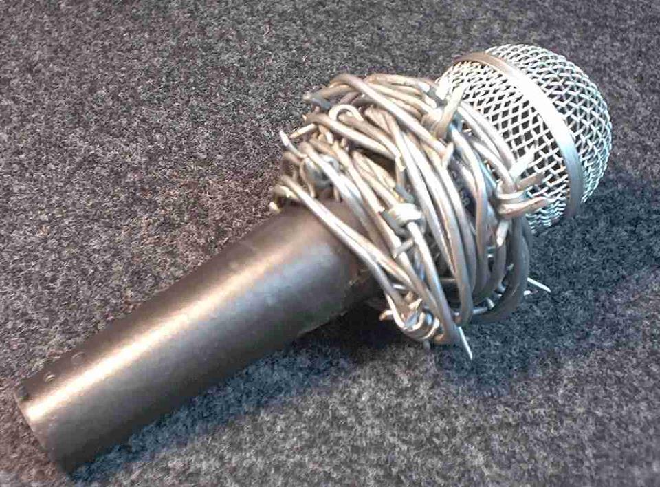Okay... who here might know a novelty fabricator? I will order a half dozen of these if they could be made as a slip-on, rubber (read soft, blunt), imitation of the real barbed-wire. I would keep them handy for when I know the song or singer is "cup-prone" and then I'd simply slide it onto the mic and hand it to the singer. Mission accomplished.