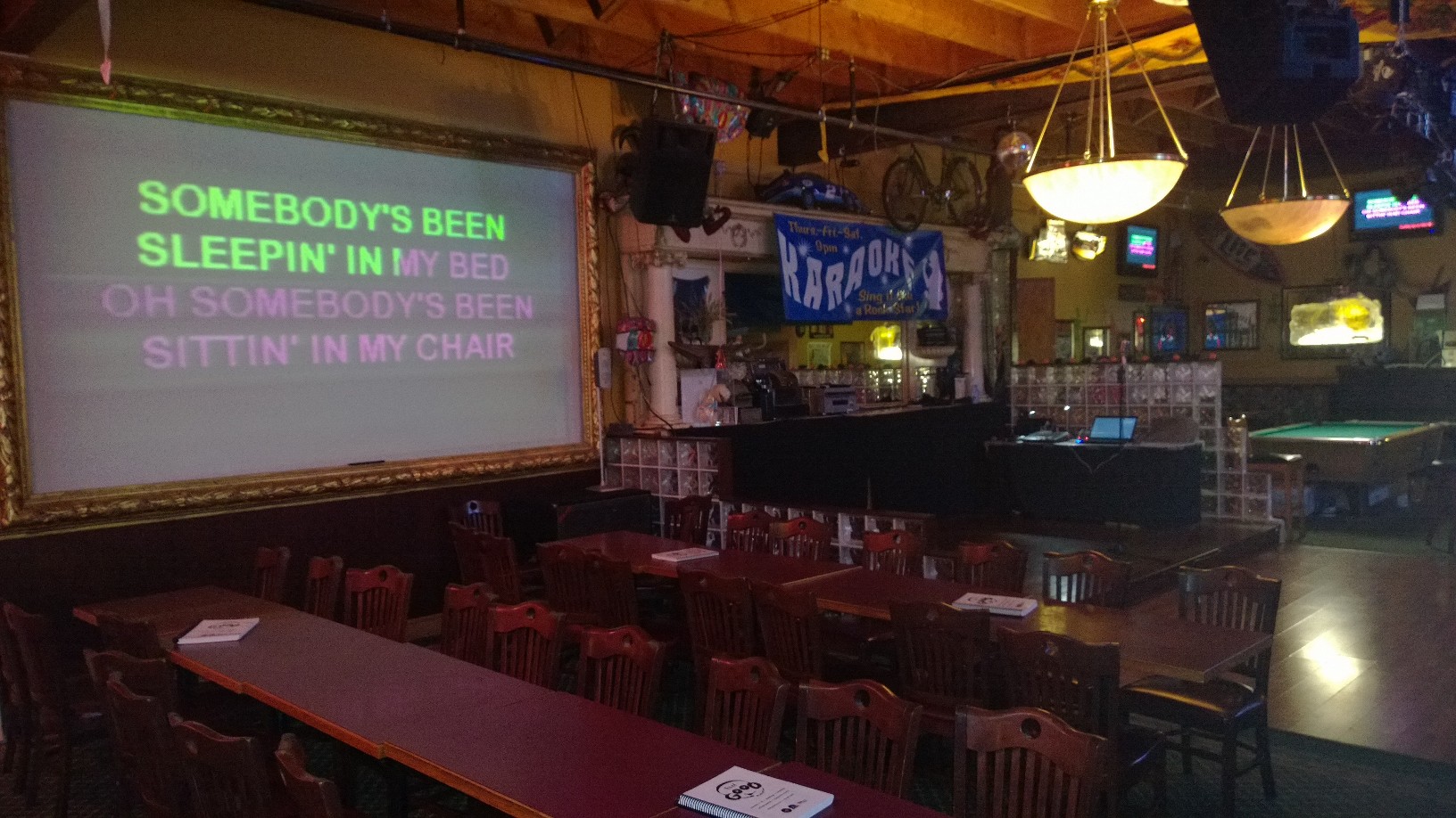 NoShameKaraoke wrote: Where are the singers looking for the lyrics? I like that you have the big projection behind them so the bar can follow along, though. In the panorama pic, just left of center you will see a 42" TV on the wall. I do wireless HDMI to that screen for singer lyrics. This isn't a super fancy venue, but it is a large venue. I was told they had there best Thursday in 6 months last night. For that I credit my wife who has been doing 90% of our marketing for almost a year now. She has done a fantastic job of keeping our name in front of the karaoke community, creating fun, engaging social media marketing, and putting up with the monstrous amount of time that karaoke has consumed in the past few months. I just might have to put her on the payroll.  -Chris