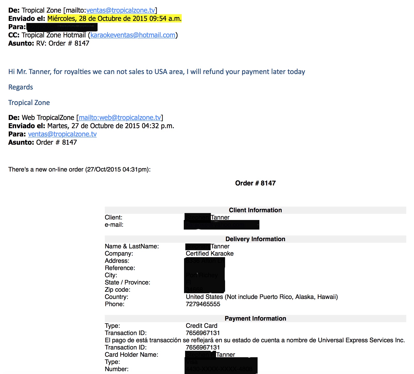 Copy of the email of your refund with explanation that they are unable to sell to USA.