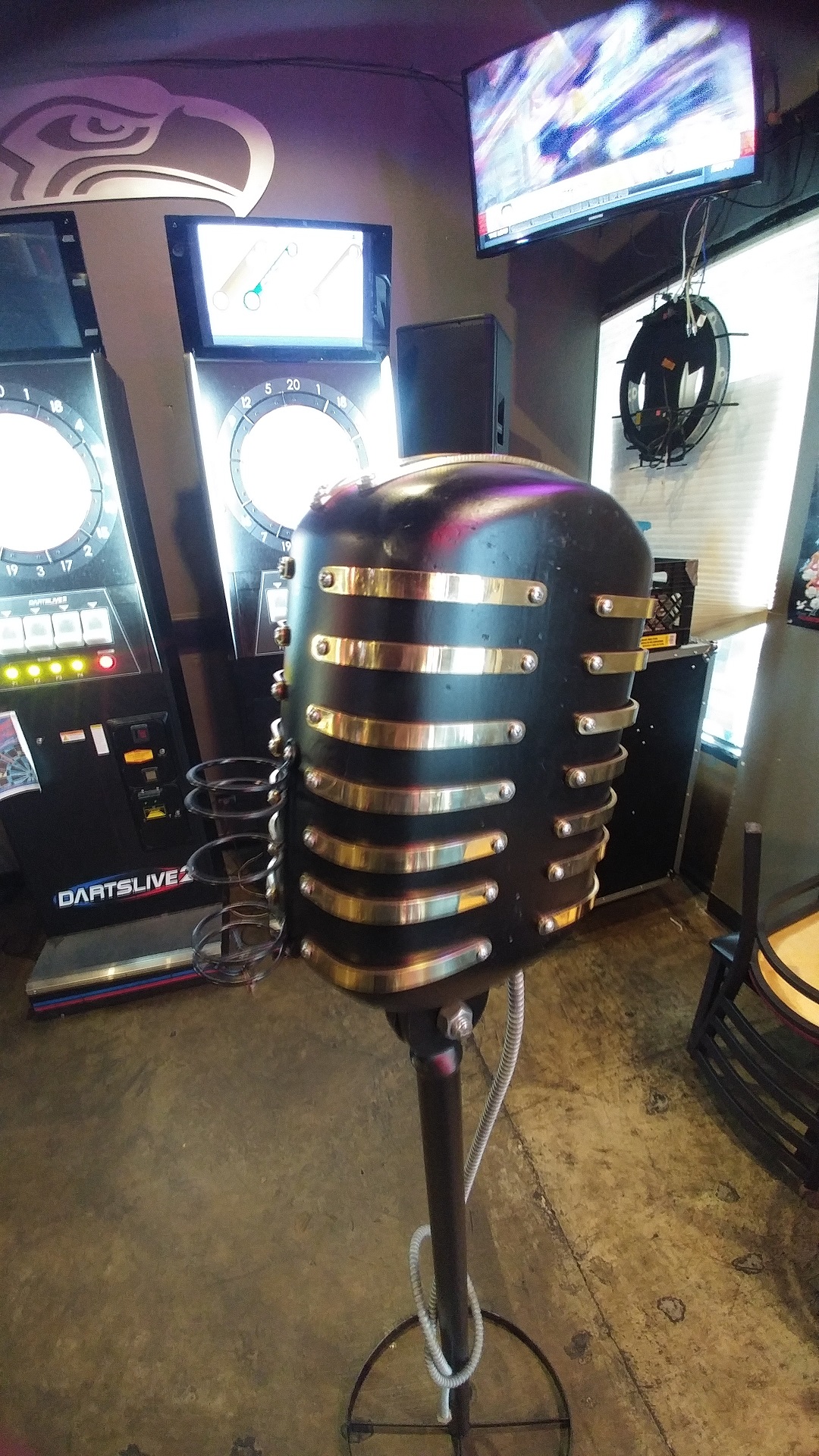 A regular at one of our locations made this awesome mic holder/stand for one of our KJ's. The wireless mic drops into a set of rings on the front of the mic. Seems they are using it as a mic stand as well on karaoke nights with some fun results!
